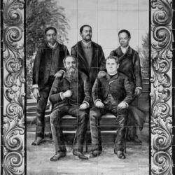 Fotografia que serviu de base ao trabalho em azulejo que se encontra no átrio de entrada do Seminário das Missões de Cernache do Bonjardim, que acima se reproduz. Os Padres António Barroso e Sebastião Pereira, em 1881, ano da fundação da Missão de São Salvador do Congo, com dois filhos e um sobrinho do rei local (Álvaro Tangue, Nicolau Diungo e Álvaro Mascapai).